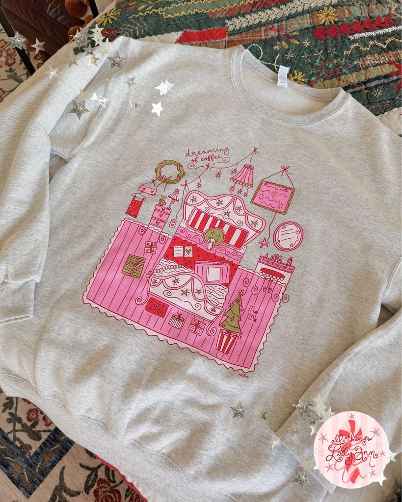 -the comfiest oatmeal ash grey crewneck with a big hand illustrated girly whimsy room on the front!