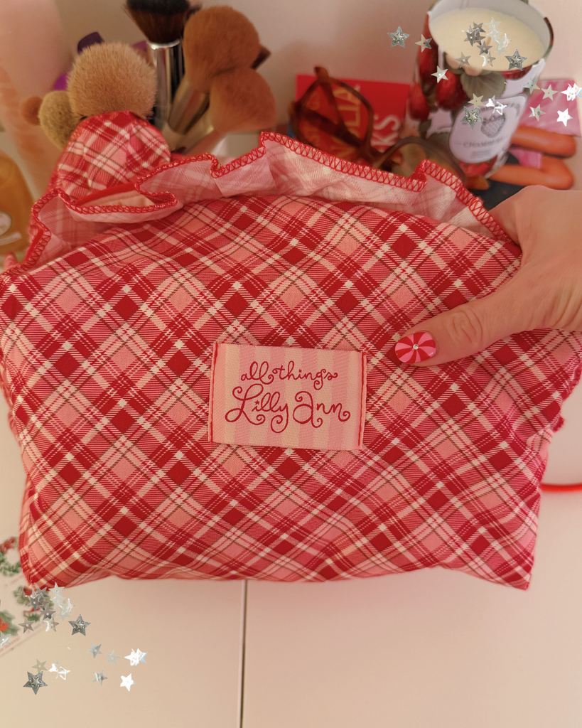 The cutest pink and red checkered makeup pouch for all the girly girls! Would be super cute to hold your makeup, pens/pencils, craft supplies, and whatever else your sweetie heart desires!!! I personally use one for makeup and one in my lace trimmed tote as a catch all!!!